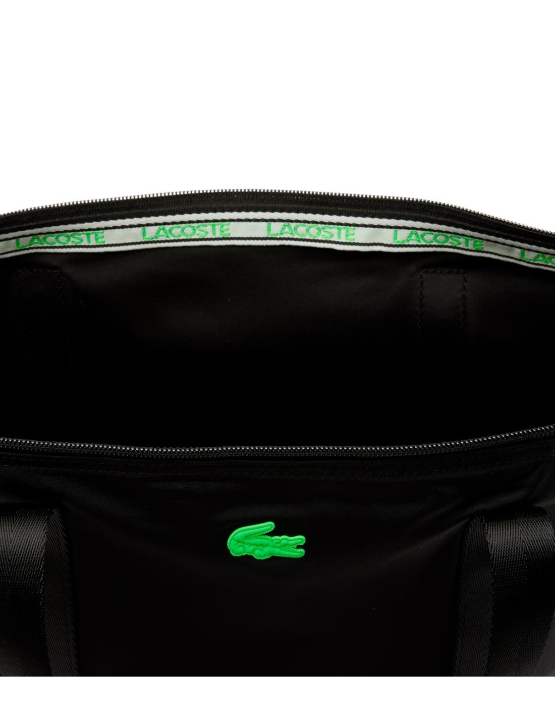 El Bolso Tote con Cremallera de Lacoste presenta un estilo deportivo y está confeccionado en un tejido de nylon ultraligero, tiene asas tejidas con diseño de rayas y un tirador a juego.
