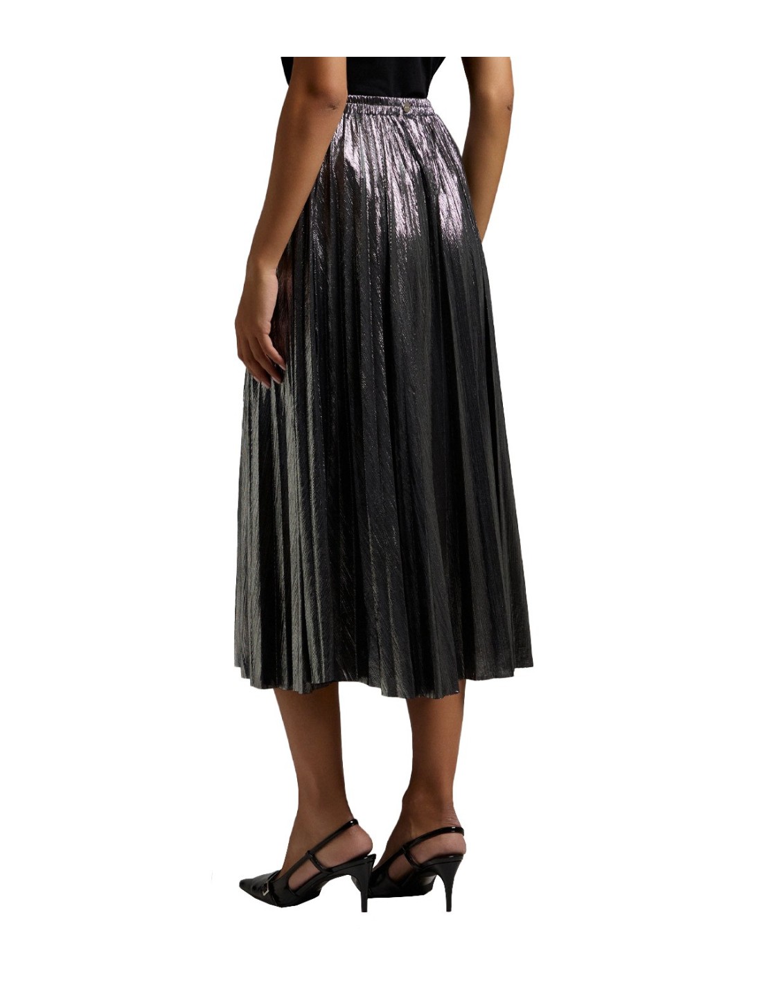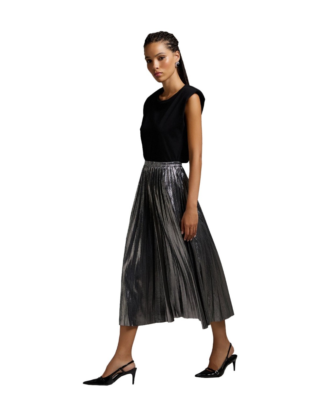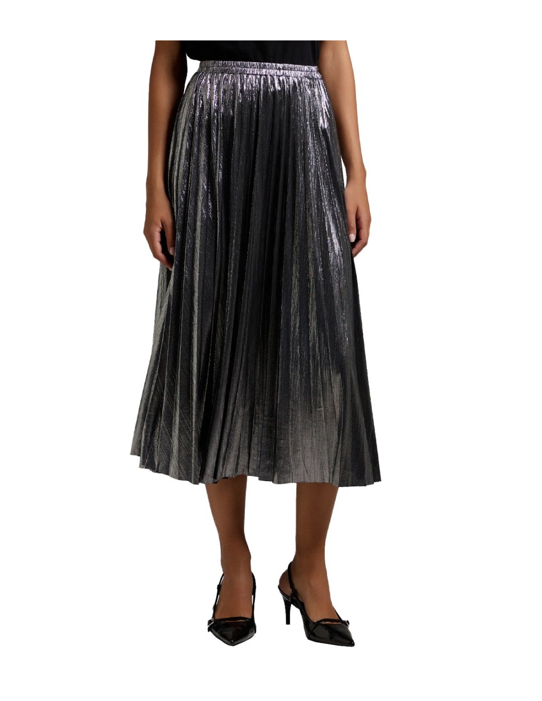 La falda plisada midi de BSB es una prenda elegante y moderna, perfecta para cualquier ocasión especial. Su diseño plisado metalizado añade un toque de brillo y sofisticación al conjunto. Con corte midi y cintura elástica, se adapta cómodamente a la figura, ofreciendo un ajuste favorecedor. El corte regular resalta la silueta de manera sutil y estilizada. Ideal para combinar con blusas o suéteres, esta falda es una opción versátil y de tendencia.