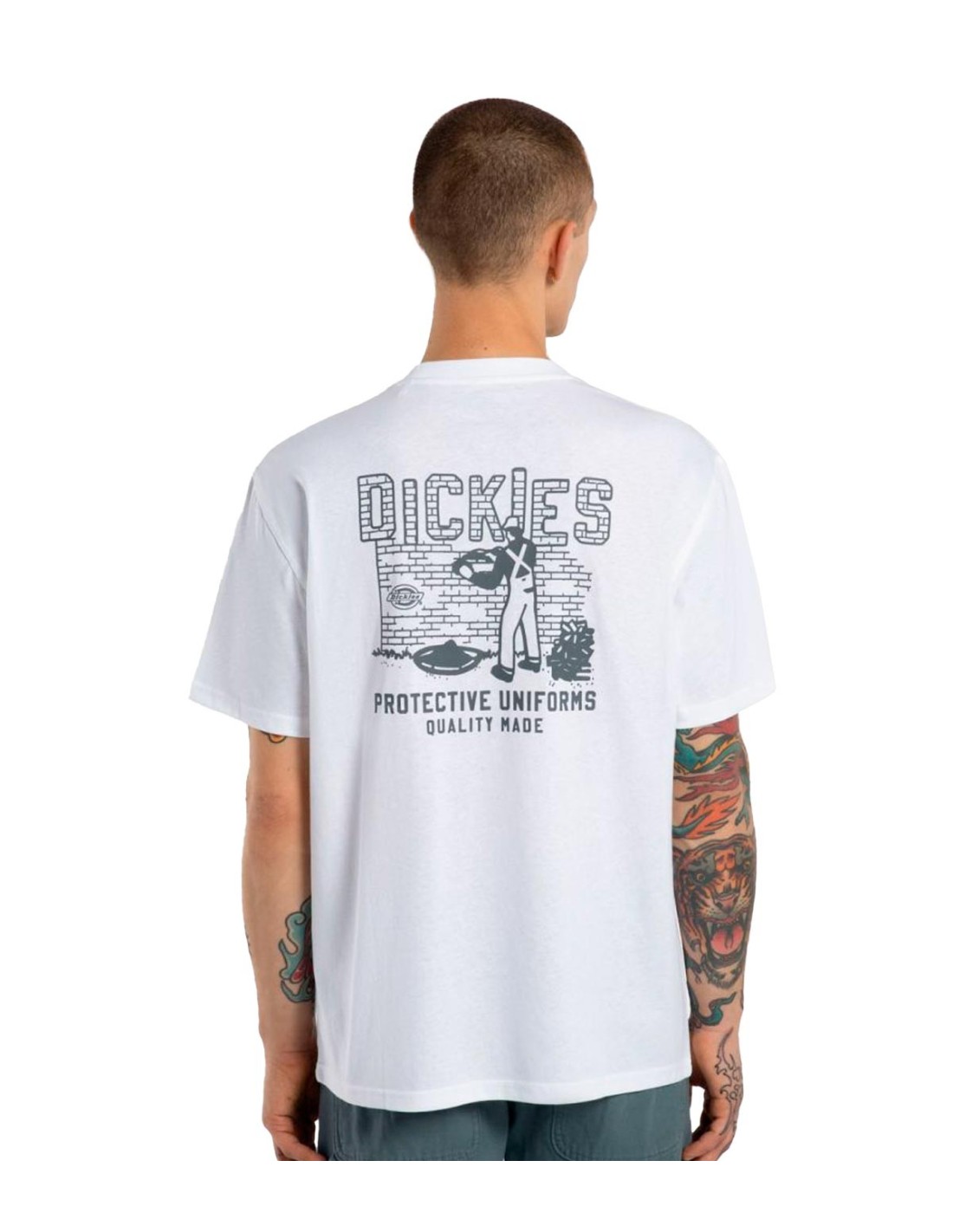 DickiesLa camiseta Bricklane de Dickies en color blanco es una opción fresca y estilosa. Con manga corta, cuello redondo y un corte relajado, garantiza comodidad durante todo el día. En la parte posterior, presenta un estampado gráfico con el lema «Protective uniforms made for life». Fabricada en 100% algodón, es suave y transpirable. Perfecta para un look casual con un toque de estilo industrial.