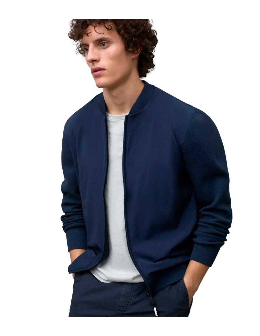 La chaqueta de punto Kobus de Ecoalf, en color azul, combina estilo y sostenibilidad en una pieza única. Con diseño tipo bomber, presenta un cierre frontal de cremallera para mayor comodidad. Sus bolsillos invisibles delanteros añaden funcionalidad sin sacrificar el diseño. El cuello, los puños y el dobladillo de canalé aseguran un ajuste cómodo. Fabricada con un 86% de poliamida reciclada y un 14% de elastano en el tejido principal, y 100% poliéster reciclado en el punto. Una opción ecológica y moderna para cualquier ocasión.