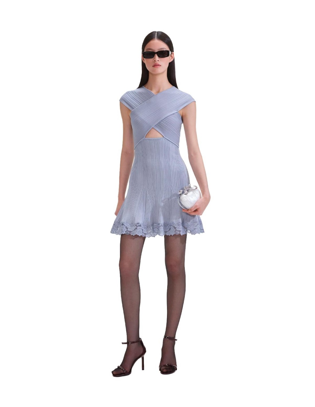El vestido de punto con encaje de Self Portrait en color lavanda es elegante y sofisticado. Con cuello de pico y manga corta, presenta un diseño femenino y fresco. Destaca por un delicado recorte en la parte delantera y adornos de encaje en la falda que aportan un toque de glamour. Su composición de 50% viscosa, 32% poliéster, 16% poliamida y 2% elastano asegura comodidad y ajuste perfecto. Ideal para ocasiones especiales, fusiona estilo y detalles refinados.