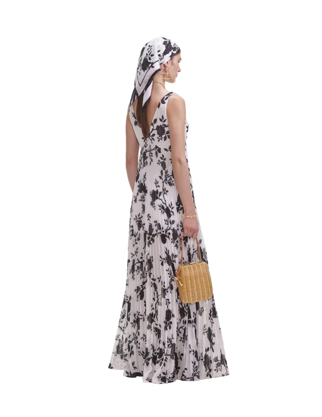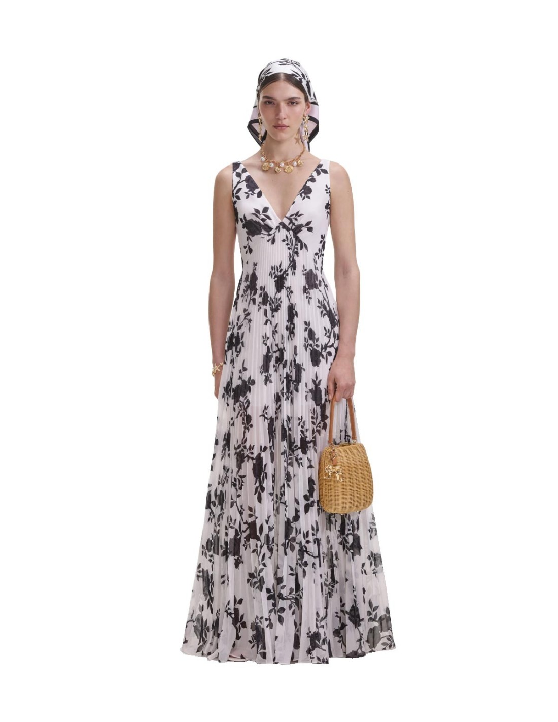 Self PortraittEl vestido largo con estampado floral de Self-Portrait es blanco con delicados detalles florales en negro. Su diseño sin mangas y cuello en V resalta una silueta elegante, mientras que el tejido plisado añade movimiento y sofisticación. Perfecto para eventos formales y ocasiones especiales.