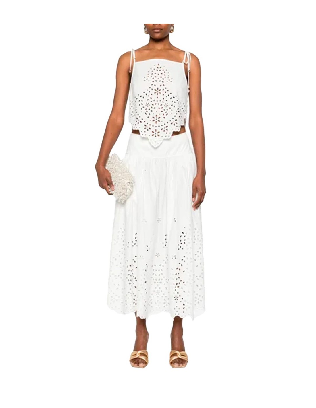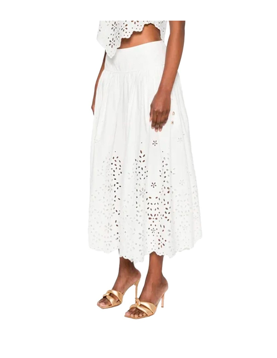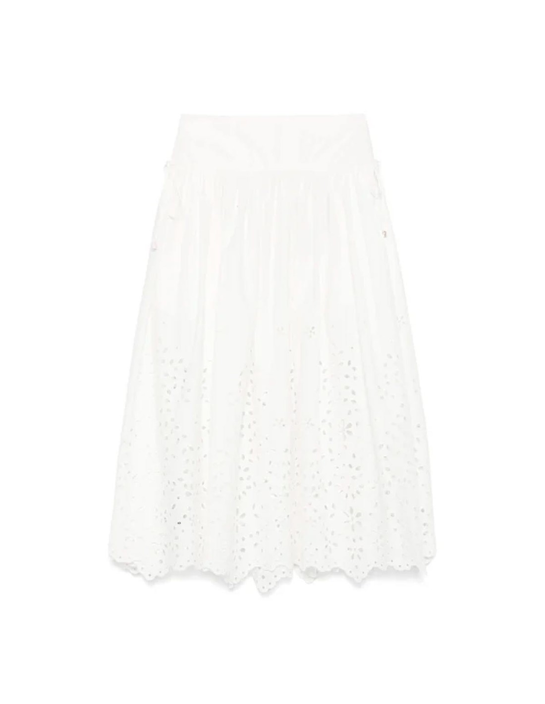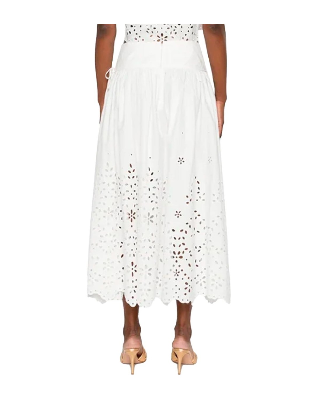 Self PortraittFalda bordada de Self-Portrait en color blanco, delicadamente confeccionada con encaje que aporta un toque elegante y femenino. Su corte por debajo de la rodilla ofrece un estilo sofisticado y versátil, ideal para ocasiones especiales o looks diarios. La combinación de la textura bordada y el diseño cuidado hacen de esta falda una pieza única. Perfecta para quienes buscan elegancia con un aire romántico y moderno.