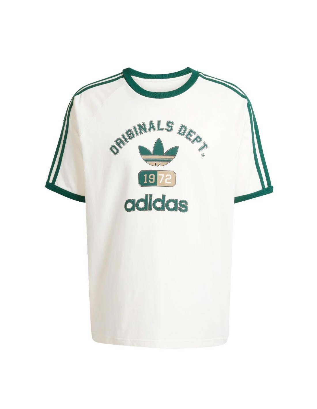 adidasLa Camiseta OG Dept de Adidas combina estilo retro y comodidad en un diseño atemporal. De color blanco, presenta un cuello redondo con una franja verde que se extiende hacia los hombros, aportando un toque distintivo. En el frente, luce el gráfico "Originals Dept 1972" junto al icónico trébol, resaltando el legado de la marca. Su ajuste holgado brinda libertad de movimiento y un look relajado. Confeccionada en 100% algodón, incluyendo un 20% de algodón ecológico, es una opción cómoda y sostenible.