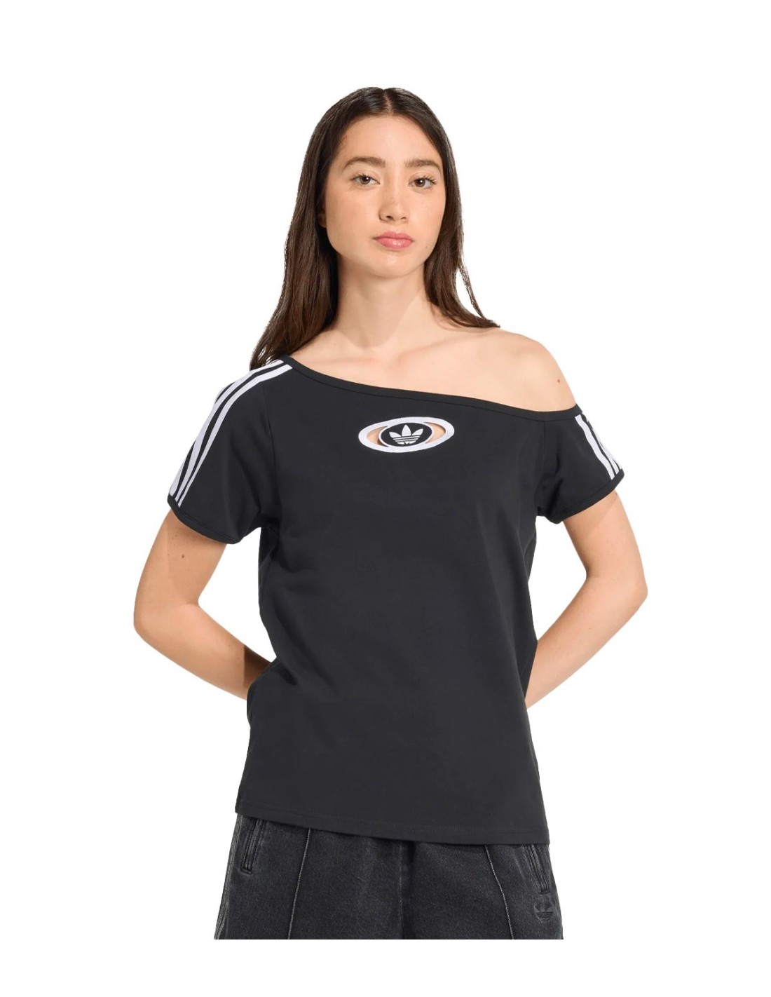 adidasLa Camiseta Offshoulder de Adidas en color negro combina el estilo clásico con un diseño audaz y contemporáneo. Luce el trébol y las icónicas 3 franjas en blanco, destacando el ADN de la marca. Su corte con hombro al aire y el logo campus recortado le dan un giro inesperado y moderno. Con un ajuste regular y confeccionada en una mezcla de algodón y poliuretano, ofrece comodidad y estilo para cualquier ocasión.