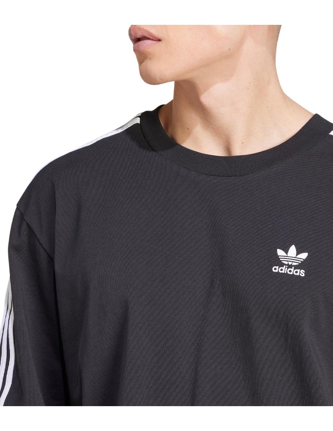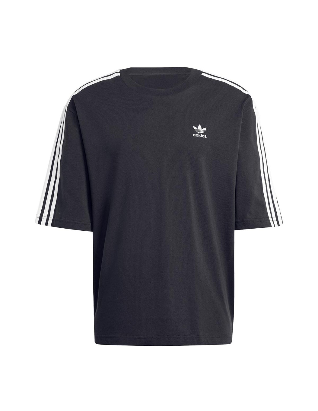 Camiseta Oversize Con Logo de Adidas que conserva su esencia clásica con un corte holgado. Confeccionada en suave algodón negro, presenta un cómodo cuello redondo de canalé y mangas cortas caídas. El icónico trébol y las franjas blancas sobre los hombros aportan un toque clásico y llamativo. Ideal para un look urbano con el inconfundible estilo de adidas.
