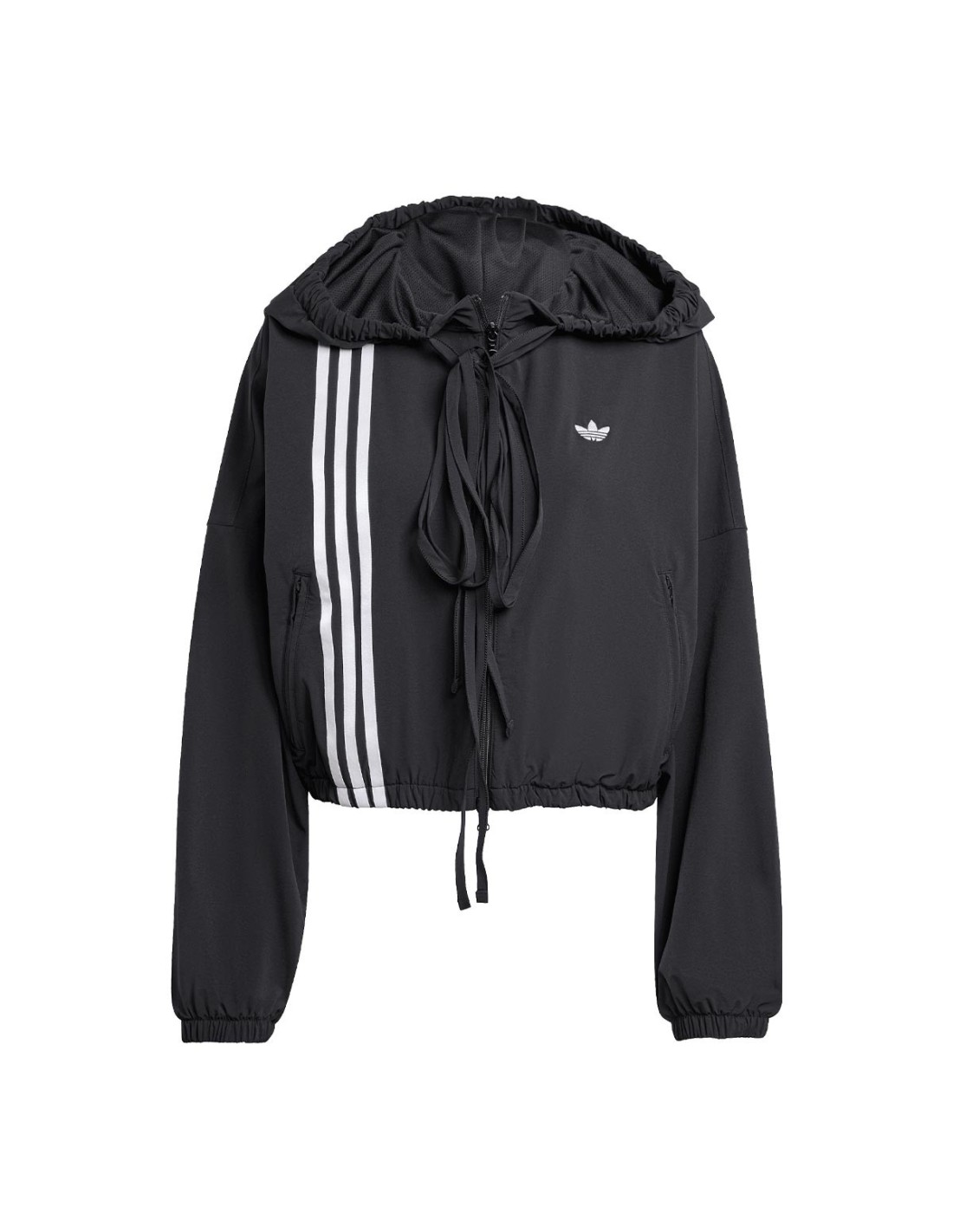 adidasSudadera Ribbon Tracktop de Adidas en color negro que combina estilo deportivo y detalles femeninos. Cuenta con capucha ajustable y una gran lazada frontal que aporta un toque único y moderno. Las icónicas stripes y el trébol en blanco resaltan en el pecho, destacando su identidad adidas. Perfecta para un look casual y sofisticado con máxima comodidad.