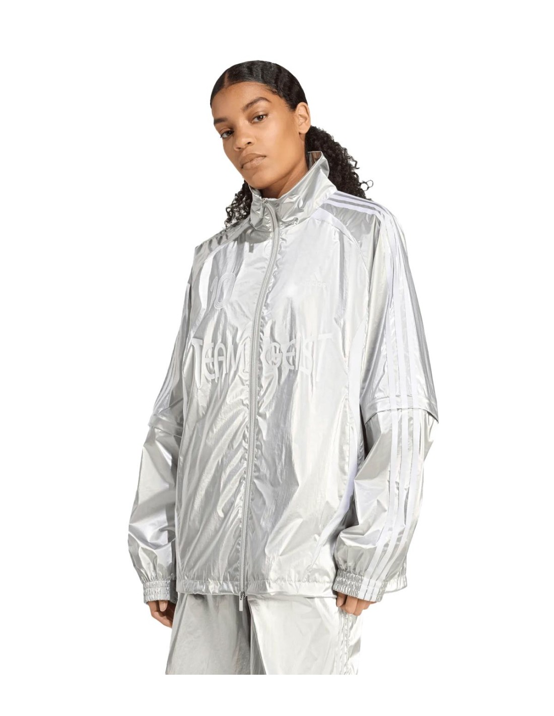 adidasLa Chaqueta Silver Track Top de Adidas en color plateado destaca por su diseño llamativo y funcional, con mangas largas desmontables adornadas con las clásicas stripes blancas. El trébol en el pecho y el número 10 en la espalda le aportan un estilo deportivo y auténtico. Su cuello alto brinda un toque moderno y protección adicional. Perfecta para un look urbano con actitud y versatilidad.