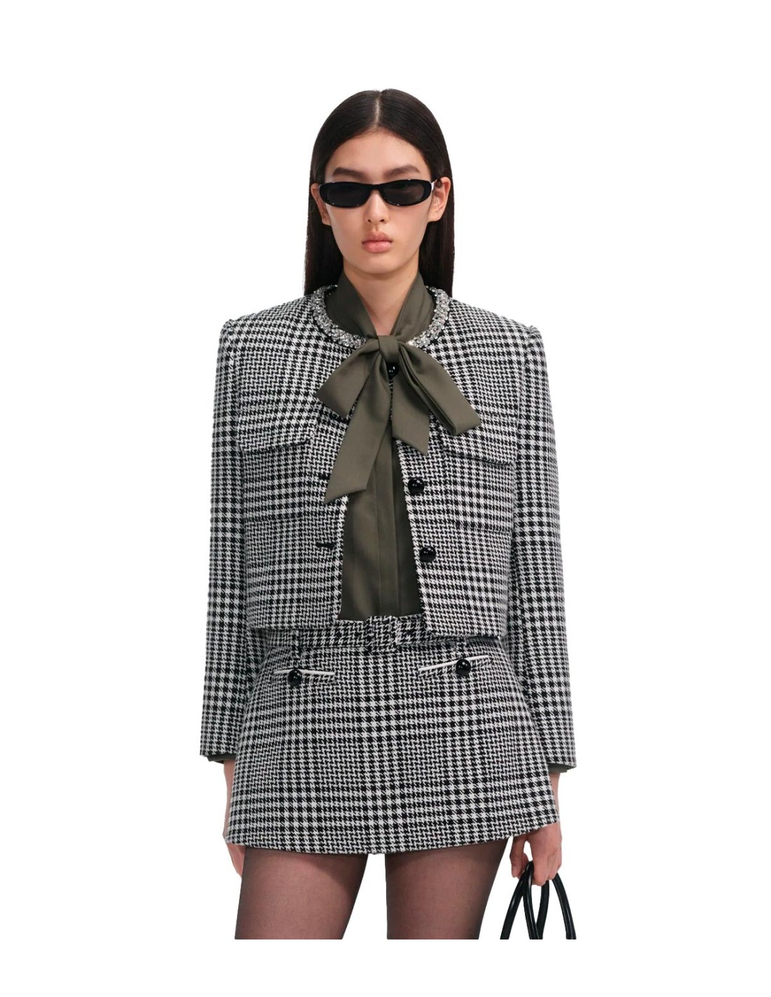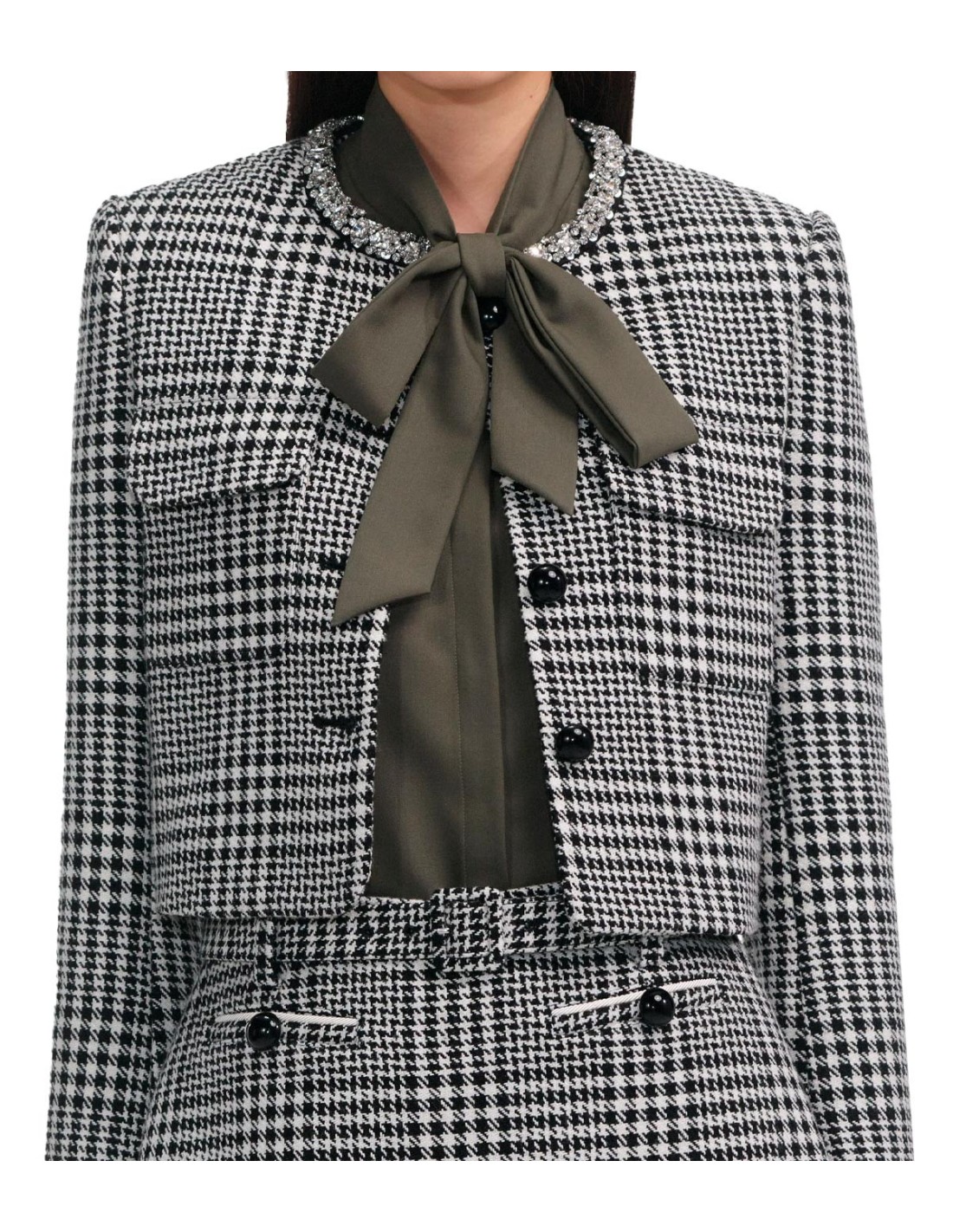 Self PortraittLa Chaqueta Corta Houndstooth de Self Portrait es una prenda elegante y estructurada con un clásico estampado de pata de gallo. Su diseño de corte ajustado incluye cuello redondo, cierre con botones en la parte delantera y prácticos bolsillos funcionales. Perfecta para añadir un toque sofisticado a cualquier conjunto. Ideal para combinar con faldas o pantalones de talle alto.