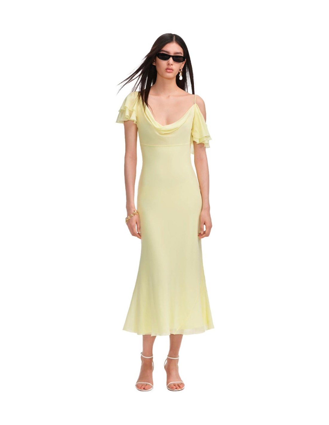 Self PortraittEl Vestido Georgette de Self Portrait en un tono amarillo destaca por su tejido ligero y fluido, confeccionado en 100% viscosa. Su diseño midi presenta un favorecedor escote desbocado que realza el cuello y los volantes asimétricos en los hombros añaden un toque de movimiento y sofisticación. Ideal para ocasiones especiales o looks frescos y modernos. Una prenda que combina estilo y comodidad con un toque femenino.