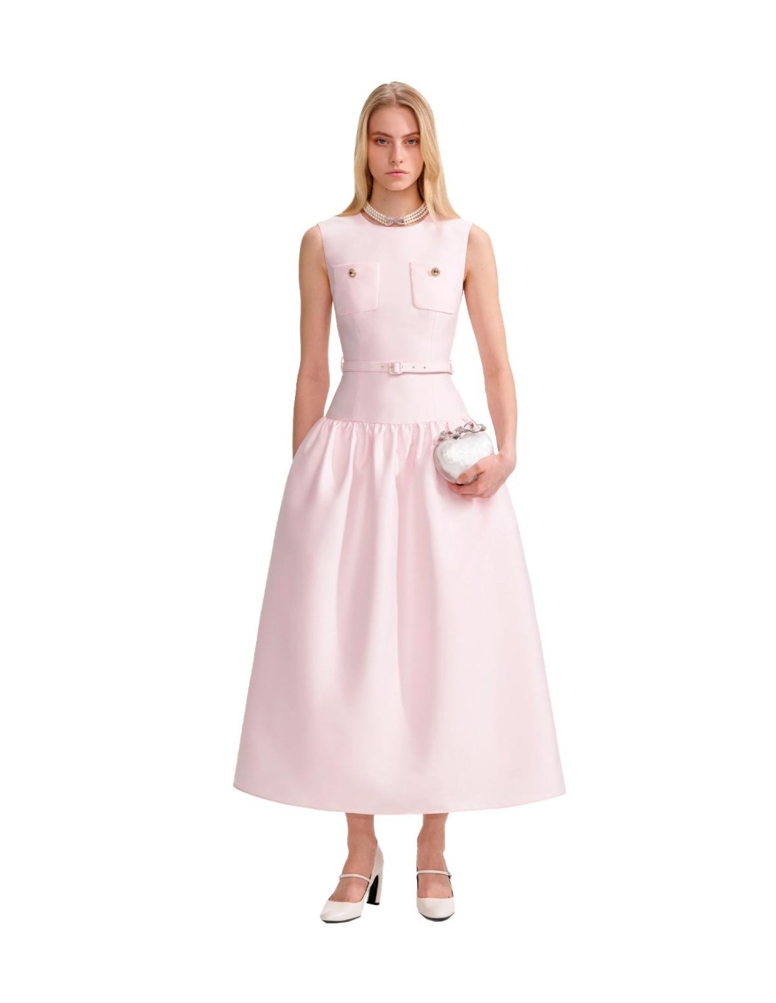 Self PortraittEl Vestido Taffeta de Self Portrait en un elegante tono rosa combina estructura y delicadeza en un diseño midi entallado. Confeccionado en tafetán de alta calidad, presenta un corte ajustado que realza la silueta, acompañado de un cinturón extraíble y botones dorados que aportan sofisticación. Cuenta con cierre de cremallera en la parte posterior superior y en la cintura para un ajuste perfecto. Una pieza femenina y refinada, ideal para eventos especiales con un toque romántico.