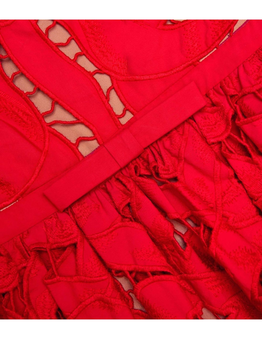 Self PortraittEl Vestido Red Bow de Self-Portrait es una elegante opción midi en color rojo vibrante, ideal para eventos especiales. Presenta un favorecedor escote de corazón y un cinturón extraíble con lazo que acentúa la cintura. Confeccionado en una mezcla de lino y algodón, ofrece un corte ajustado y está totalmente forrado para mayor comodidad. Su cierre de cremallera en la espalda garantiza un ajuste impecable y femenino.