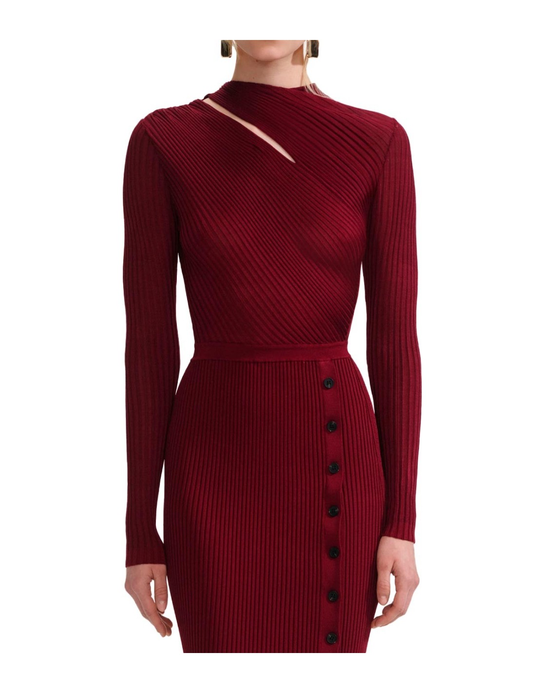 Self PortraittEl Vestido Burgundy Cut Out de Self-Portrait es una sofisticada prenda midi en color burdeos, confeccionada en punto acanalado que realza la silueta. Con cuello perkins, manga larga y hombros drapeados, combina elegancia con un toque sensual gracias a sus detalles recortados. Los botones en la falda permiten ajustar la abertura según el estilo deseado. Ideal para un look refinado con carácter y modernidad.