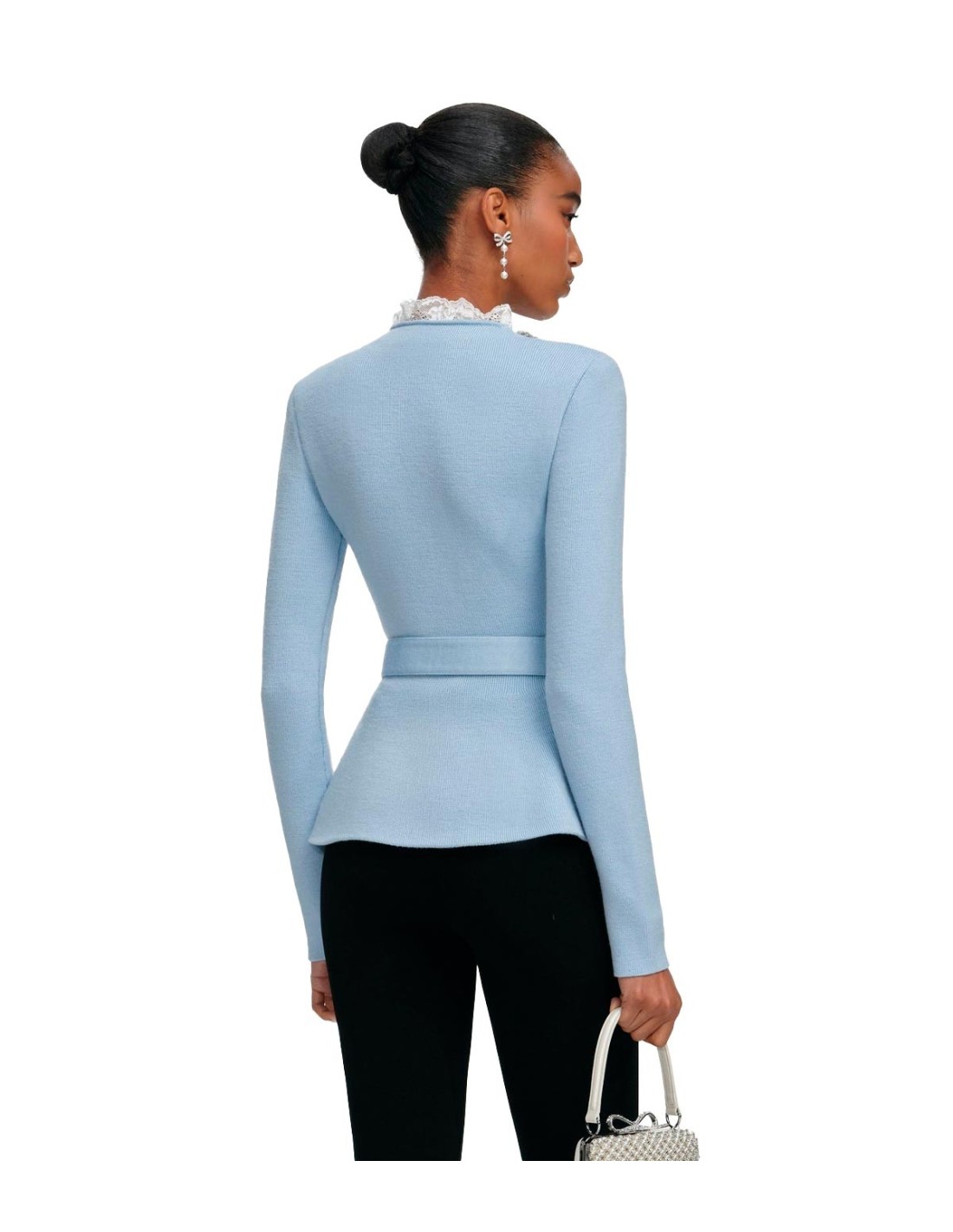Self PortraittEl Cardigan Crystal Trim de Self-Portrait destaca por su elegancia y detalle sofisticado. De color azul cielo, está rematado con ribetes de encaje y botones de strass brillantes, que aportan un toque femenino y lujoso. Su cintura peplum con cinturón realza la silueta y añade estructura al diseño. Confeccionado en una mezcla suave de lana, algodón, cachemira y otros materiales, combina confort y estilo en una prenda única.