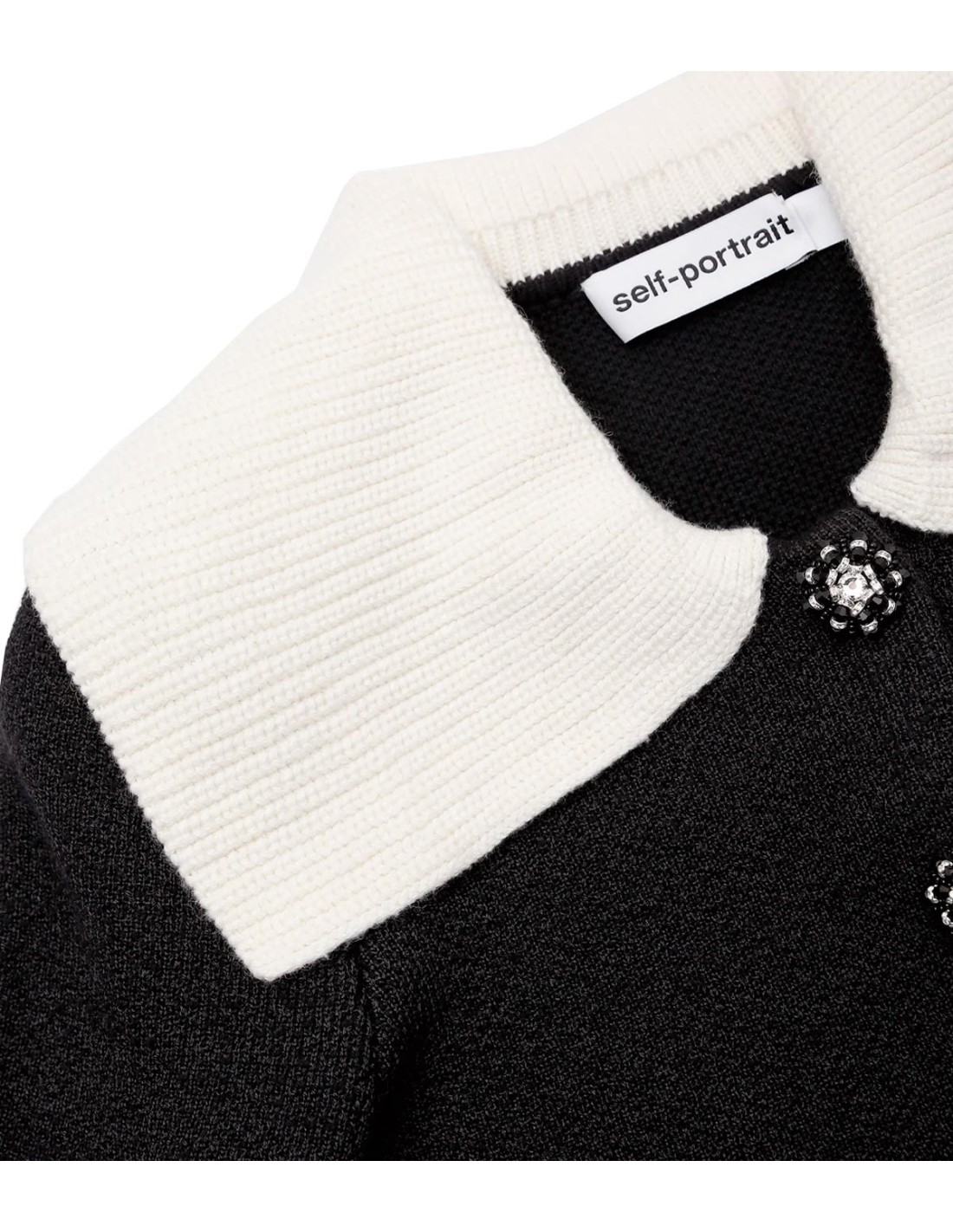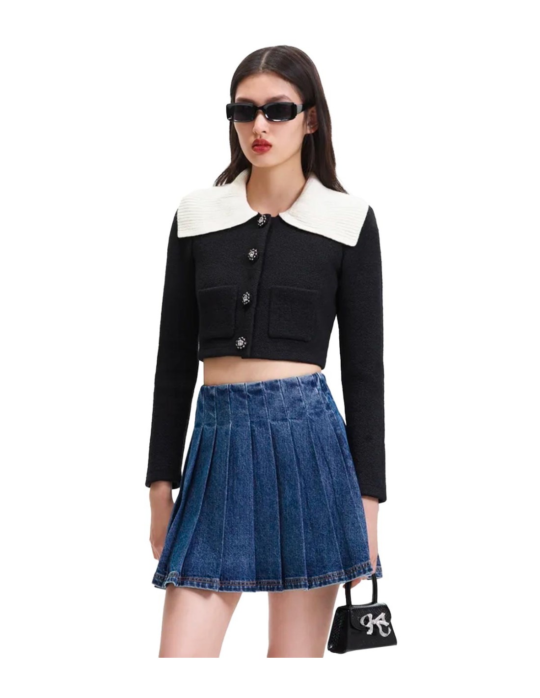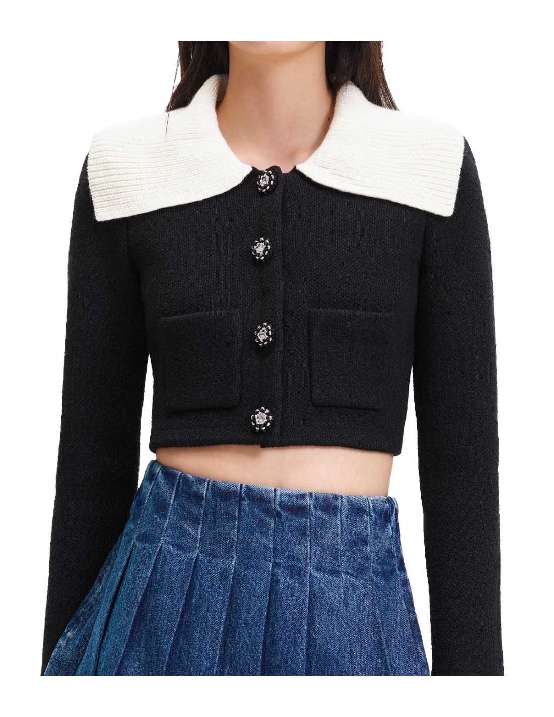 Self PortraittLa Chaqueta Abotonada de Self-Portrait es una prenda sofisticada en color negro con un llamativo cuello extragrande en contraste que enmarca elegantemente el rostro. Su diseño cropped realza la silueta y añade un aire moderno y femenino. Los botones de strass en la parte delantera aportan un toque de brillo sutil pero impactante. Ideal para combinar con pantalones de talle alto o faldas y lograr un look chic y refinado.