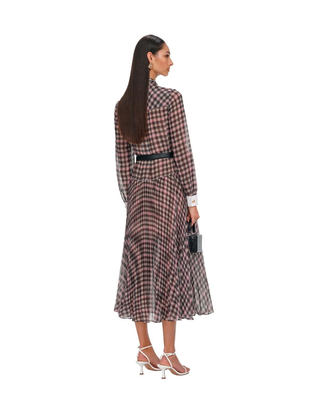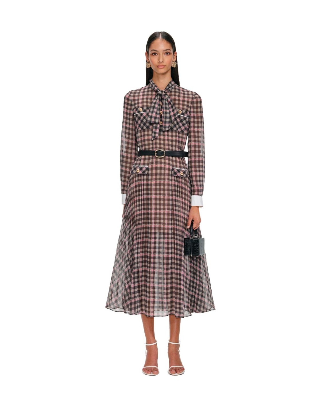 El Vestido A Cuadros de Self-Portrait combina elegancia y comodidad en un diseño midi de tejido ligero y fluido. Presenta un estampado de cuadros con ribetes en contraste y brillantes botones dorados que aportan sofisticación. Su escote con lazo añade un detalle chic y femenino, perfecto para cualquier ocasión. Una prenda versátil que destaca por su estilo único y delicado.