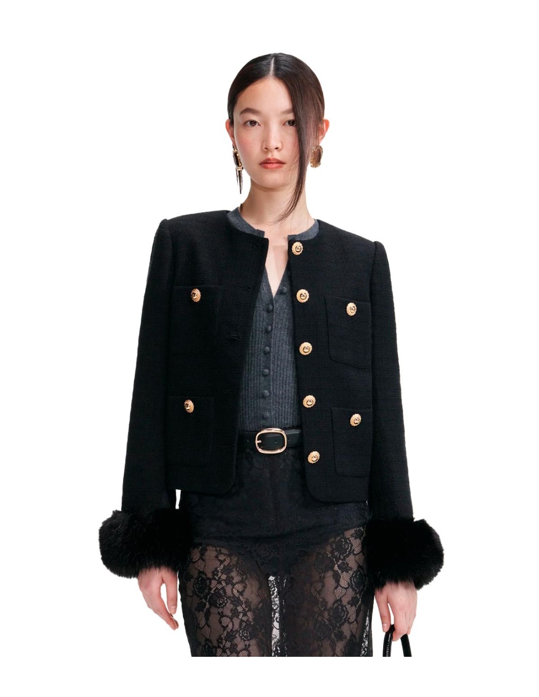 Self PortraittLa Chaqueta con Puños de Piel de Self-Portrait en azul marino combina elegancia y sofisticación con un diseño clásico. Presenta un cuello redondo que aporta un aire refinado y botones dorados que añaden un toque de brillo sutil. Los puños de piel realzan la textura y ofrecen un detalle distintivo y moderno. Perfecta para elevar cualquier conjunto con un estilo chic y atemporal.