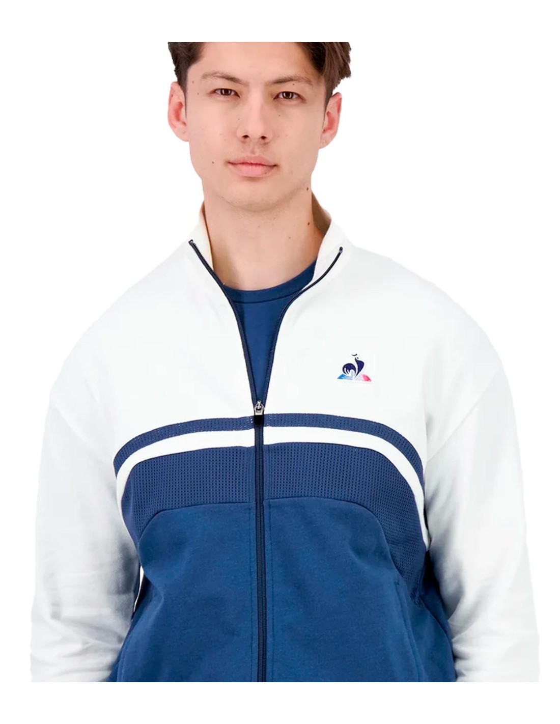 Le Coq SportifSudadera Contemporain de Le Coq Sportif con diseño moderno y deportivo, confeccionada en color azul y blanco con una franja horizontal en contraste que aporta estilo. Cuenta con cuello alto, manga larga y cierre frontal de cremallera para mayor practicidad y abrigo. El emblemático logo del gallo en el pecho resalta la identidad de la marca. Ideal para quienes buscan comodidad y un look casual con carácter francés.