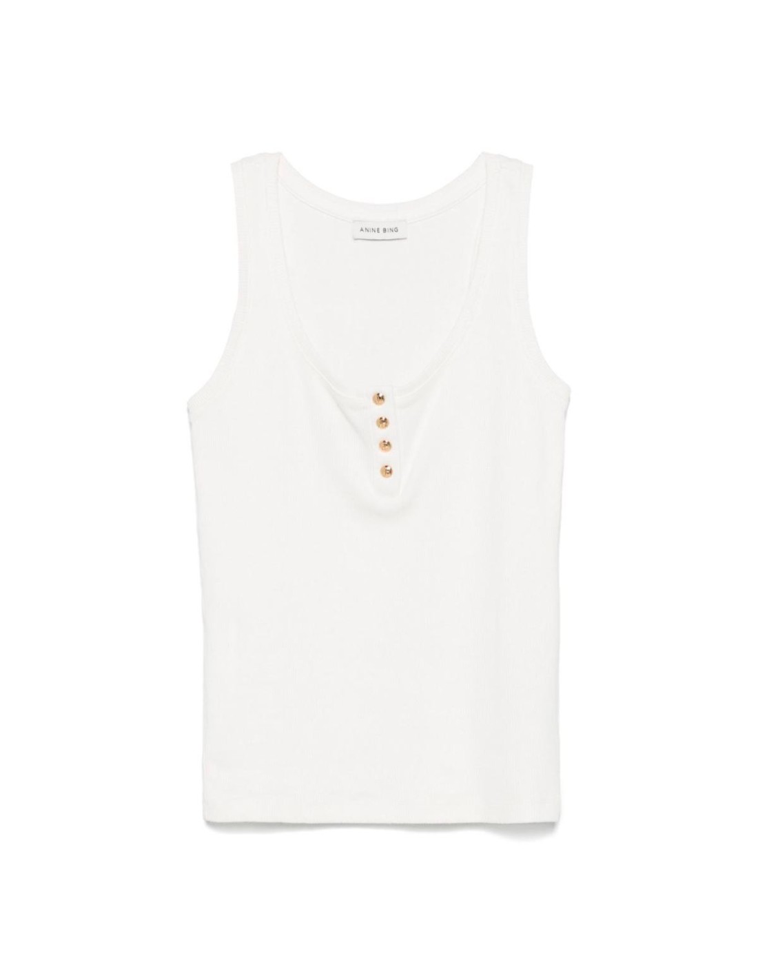 Anine BingLa Camiseta Alessia de Anine Bing es una prenda sofisticada y versátil en color blanco, ideal para looks pulidos con un toque moderno. Diseñada sin mangas y con cuello redondo, destaca por su corte entallado que realza la silueta. Los botones dorados aportan un detalle elegante y distintivo. Perfecta para llevar sola o como base en conjuntos más elaborados.