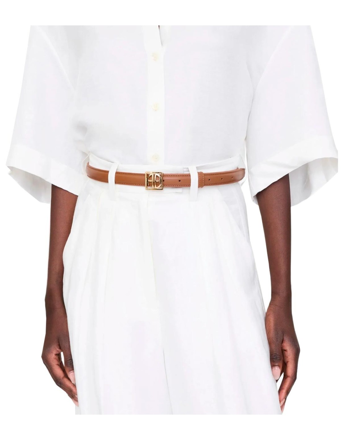 El Cinturón con Logo de Anine Bing es un accesorio sofisticado en color marrón que eleva cualquier conjunto. Su diseño clásico se complementa con una elegante hebilla cuadrada en dorado, que incorpora el logo distintivo de la marca. Fabricado con materiales de alta calidad, ofrece un ajuste cómodo y duradero. Es el complemento perfecto para añadir un toque refinado a tu look diario.