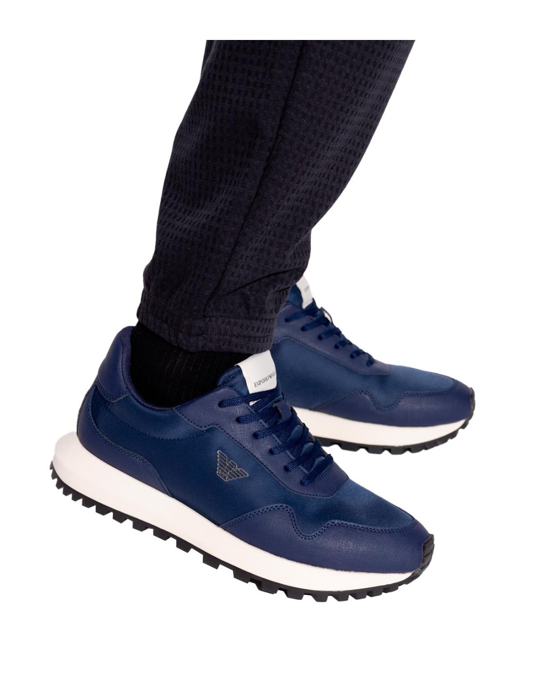 ArmaniLas Zapatillas con Logo de Emporio Armani en color azul combinan estilo y funcionalidad con una silueta estilizada y puntera redondeada que aportan una ligereza excepcional. La suela sólida destaca su herencia deportiva, mientras que la parte superior, confeccionada en piel de alta calidad y materiales sintéticos nobles, presenta un acabado mate en azul marino uniforme. Detalles como las cuidadas costuras y el logotipo metálico en forma de águila aportan un toque discreto de lujo. Perfectas para quienes buscan comodidad sin renunciar a la elegancia.