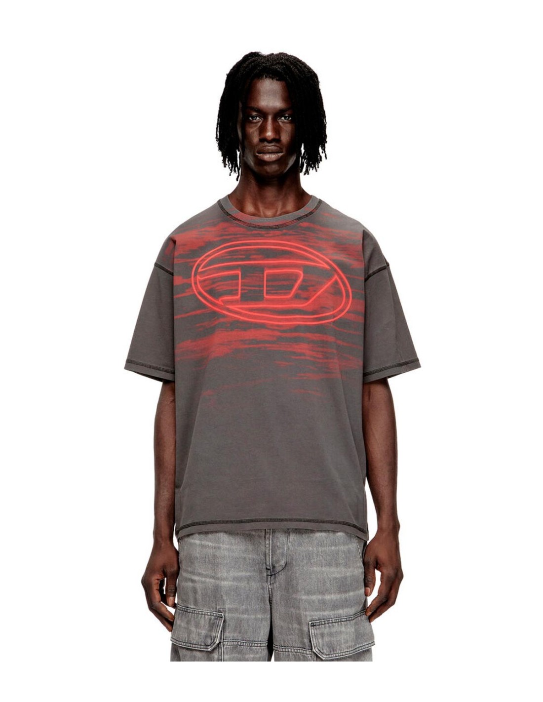 La camiseta T-Boxt-T5 de Diesel en color gris destaca por su diseño moderno y cómodo. Con cuello redondo de canalé y mangas cortas caídas, ofrece un corte amplio que garantiza libertad de movimiento. Está confeccionada en 100% algodón, aportando suavidad y frescura. En la parte delantera, luce una gran impresión del icónico logo Oval D, que añade carácter al estilo. Perfecta para un look casual y desenfadado.