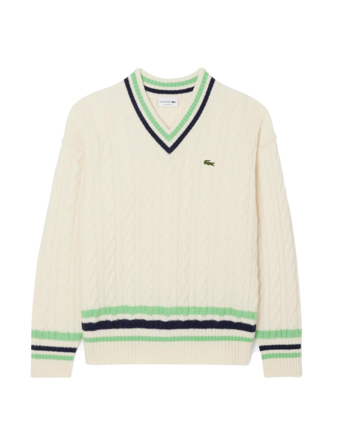 LacosteEl Jersey de Cuello en V de Lacoste en color blanco crema combina elegancia y comodidad en un diseño sofisticado. Presenta rayas en contraste en cuello, cintura y puños, junto con acabados acanalados que aportan un ajuste perfecto. Con un corte relajado y hombros ligeramente caídos, ofrece un fit cómodo y moderno. Confeccionado en una mezcla de lana, poliamida y elastano, garantiza calidez y flexibilidad. El icónico cocodrilo bordado en el pecho añade el toque distintivo y clásico de Lacoste.