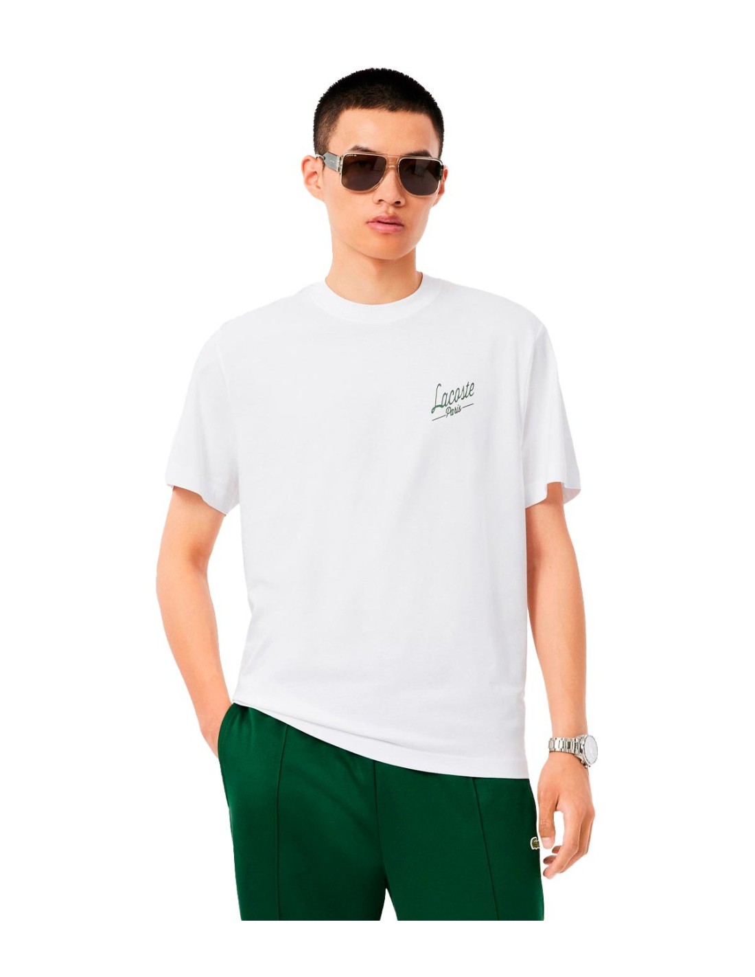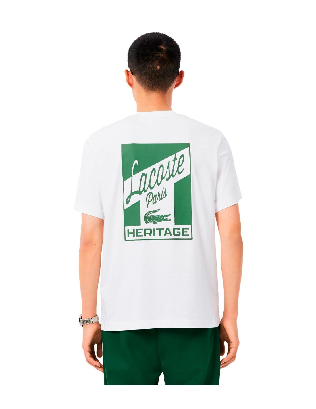 La Camiseta con Logo de Lacoste en color blanco destaca por su diseño moderno y fresco, con cuello redondo y manga corta. En el pecho luce un estampado Lacoste Paris, mientras que en la parte de atrás presenta un gran estampado y el icónico cocodrilo bordado justo debajo del cuello. Confeccionada en algodón 100%, ofrece máxima suavidad y comodidad. Ideal para quienes buscan un estilo casual con un toque urbano y distintivo. Perfecta para combinar con cualquier look.