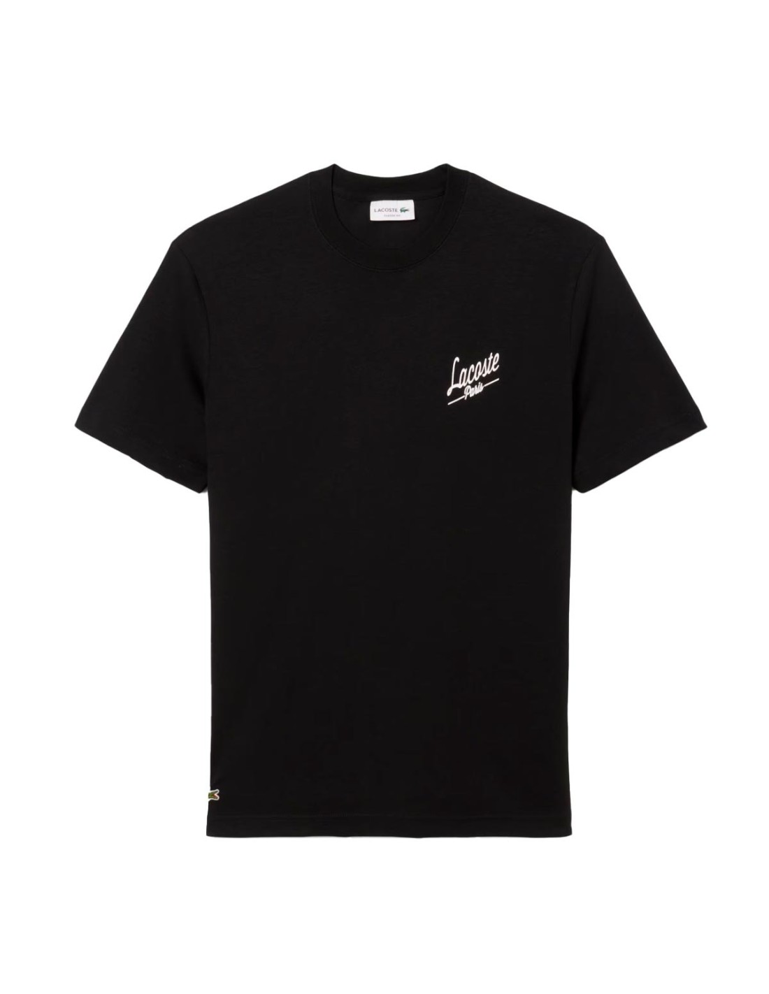 LacosteLa Camiseta con Estampados de Lacoste en color negro combina comodidad y estilo gráfico característico de la marca. Confeccionada en punto jersey de algodón 100%, presenta un ajuste clásico con cuello redondo y manga corta para un uso diario versátil. Destaca por el estampado “Lacoste Paris” en el pecho y un gran gráfico en la parte trasera, aportando un toque urbano y moderno.
