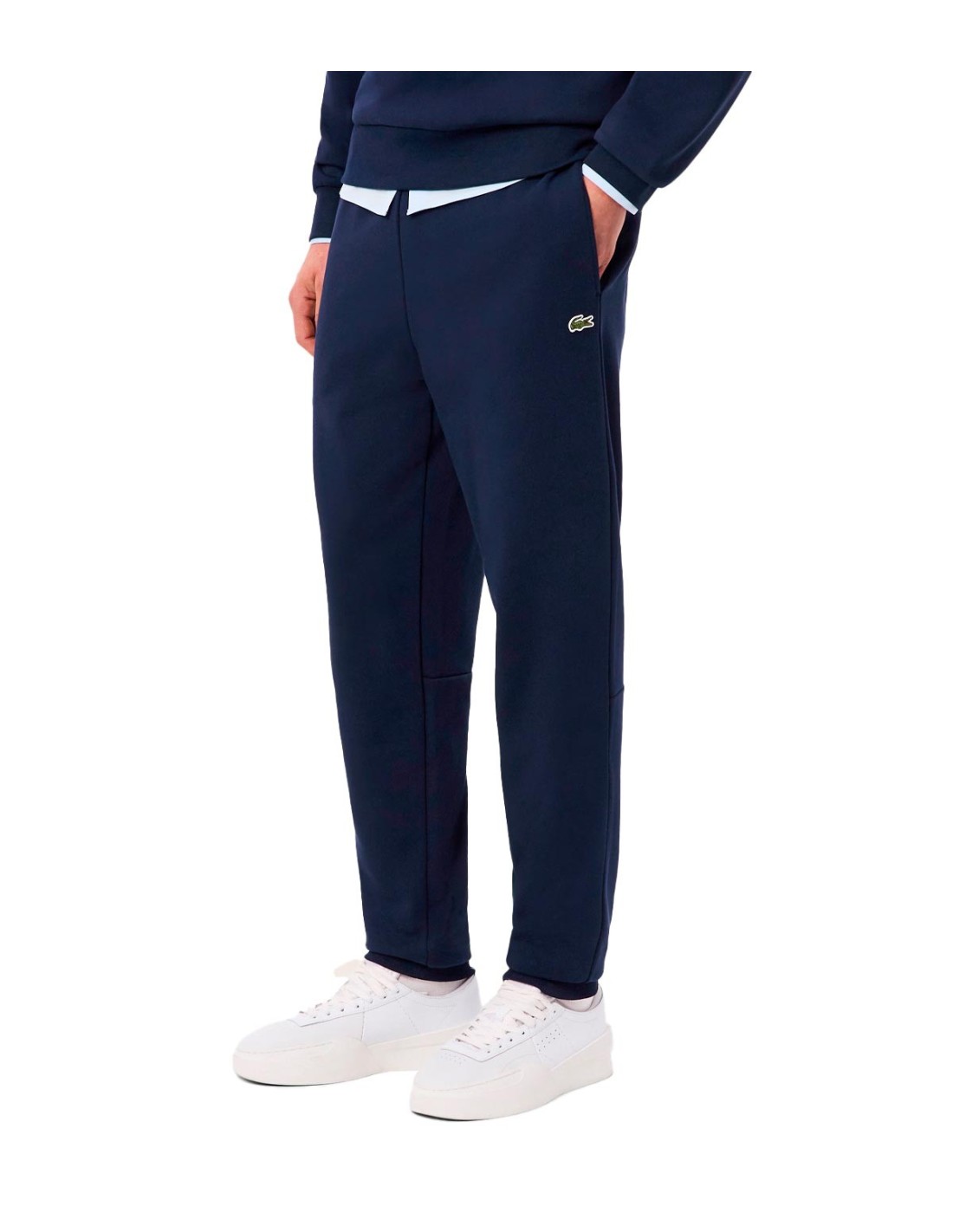 Los Pantalones Deportivos de Corte Estrecho con Cocodrilo de Lacoste en color marino combinan confort y estilo en una prenda esencial para el guardarropa masculino. Confeccionados en felpa francesa 100% algodón, ofrecen suavidad y durabilidad excepcionales. Su ajuste cónico, bajo elástico y cintura ajustable con cordón interior aseguran un calce perfecto y comodidad durante todo el día. El cocodrilo bordado en la pierna izquierda añade un detalle icónico que resalta la identidad de la marca.