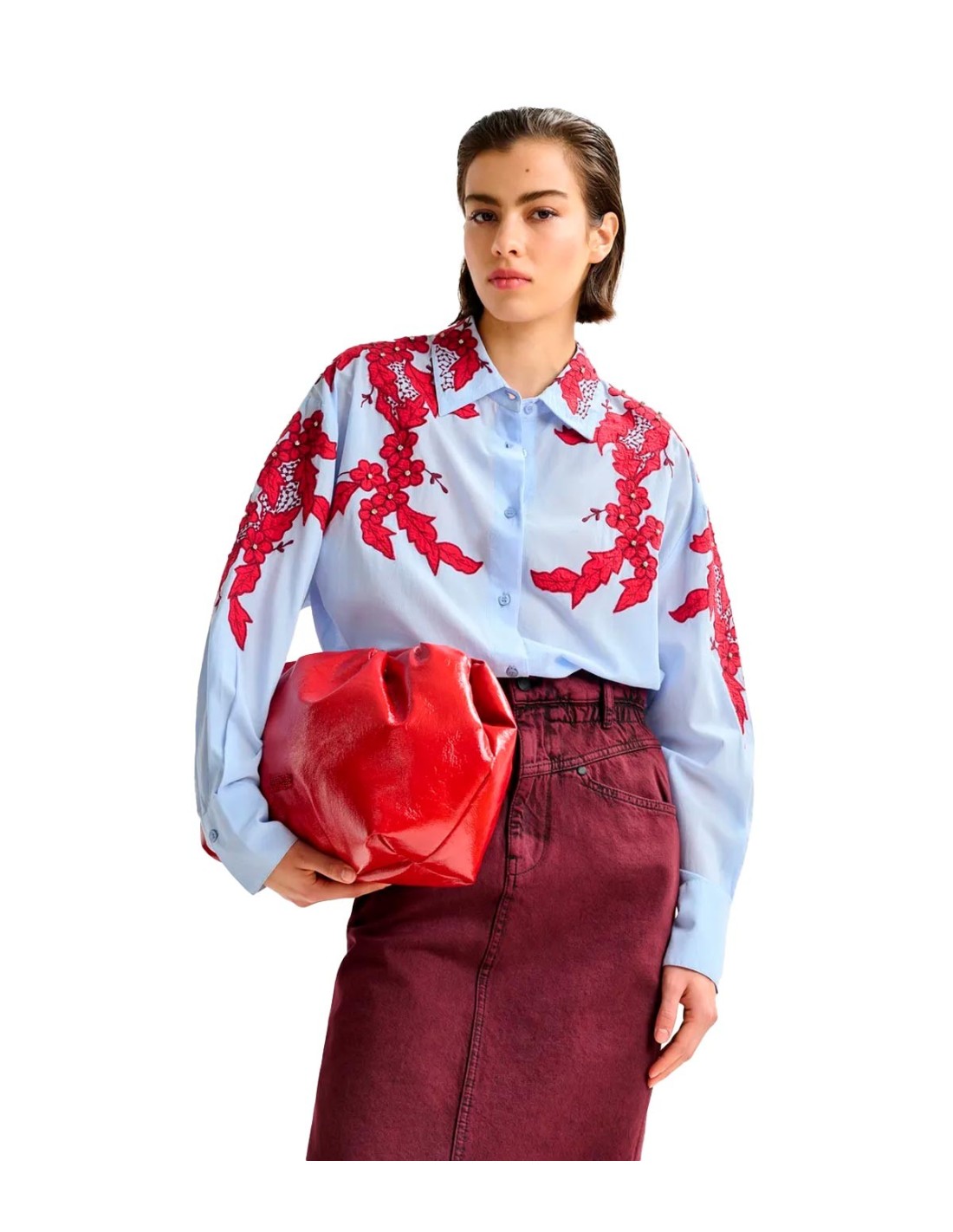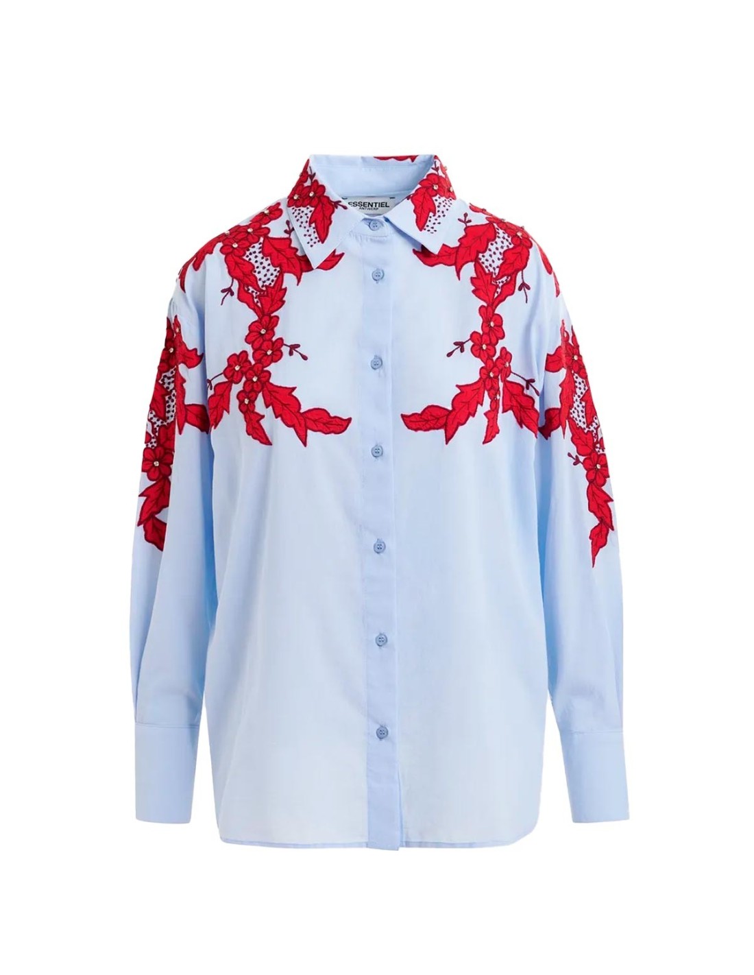 Essentiel AntwerpLa Camisa de Algodón Bordada con Adornos de Essentiel Antwerp en 100 % algodón combina comodidad y estilo desenfadado en un diseño elegante. Presenta un corte relajado, silueta cuadrada y hombros caídos que aportan libertad de movimiento. El elaborado bordado floral adornado con strass añade un detalle sofisticado y distintivo. El cierre clásico de botones se complementa con bajo redondeado, pequeñas aberturas laterales y parte trasera ligeramente más larga. Una prenda ideal para elevar los básicos diarios con un toque especial y refinado.