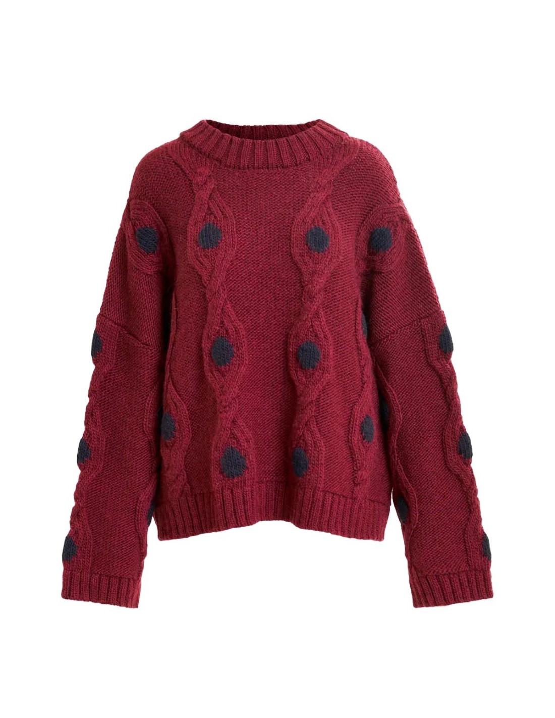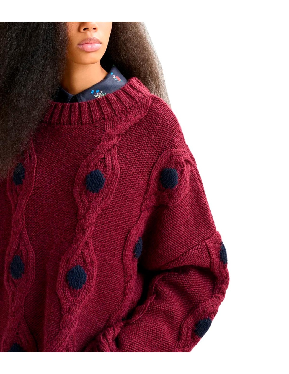 Essentiel AntwerpEl Jersey de Punto con Lunares de Essentiel Antwerp en color burdeos con lunares negros combina diseño gráfico y comodidad en un estilo elegante y desenfadado. Confeccionado en una mezcla de lana, presenta un tejido de grosor medio que aporta calidez y estructura. Su corte ligeramente cuadrado y los hombros caídos refuerzan la silueta relajada, mientras que los ribetes de canalé garantizan un acabado pulido. Los lunares negros en intarsia aportan un detalle moderno y distintivo. Fabricado en Portugal, es la prenda perfecta para combinar estilo y confort durante los días más fríos.