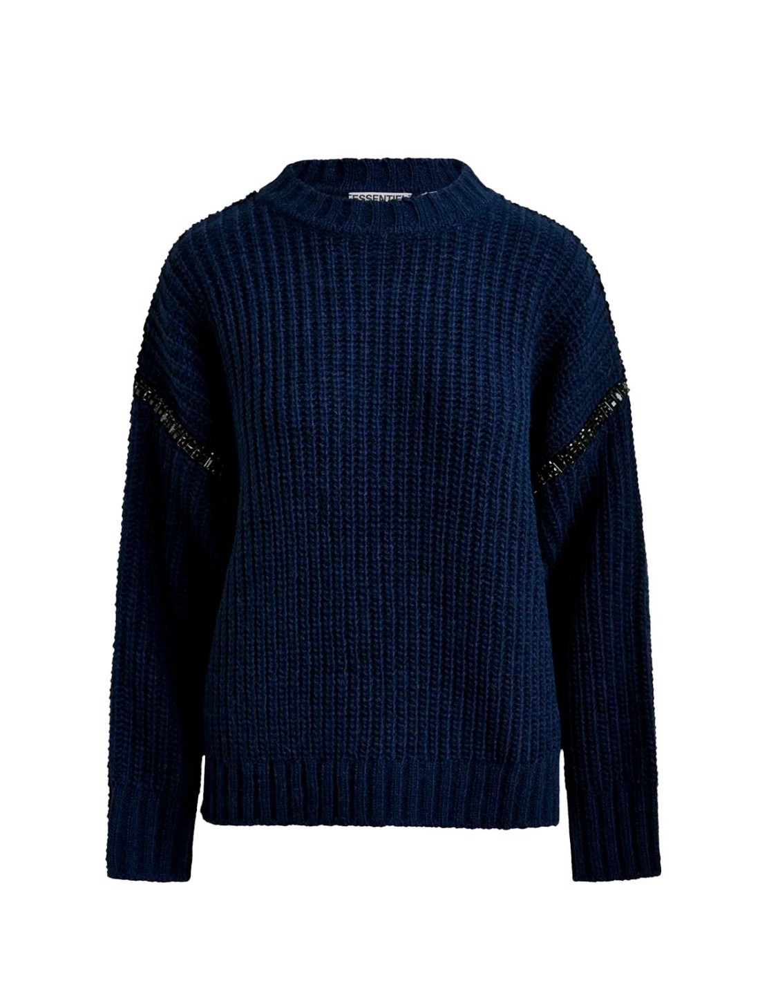 Essentiel AntwerpEl Jersey De Cuello Alto Desmontable de Essentiel Antwerp en color azul está confeccionado en una suave mezcla de lana que combina comodidad y estilo. Destaca por sus delicados adornos de pedrería que aportan un toque sofisticado. Presenta ribetes acanalados y un diseño versátil con cuello alto desmontable. Una prenda elegante y funcional, perfecta para elevar tus looks de invierno.