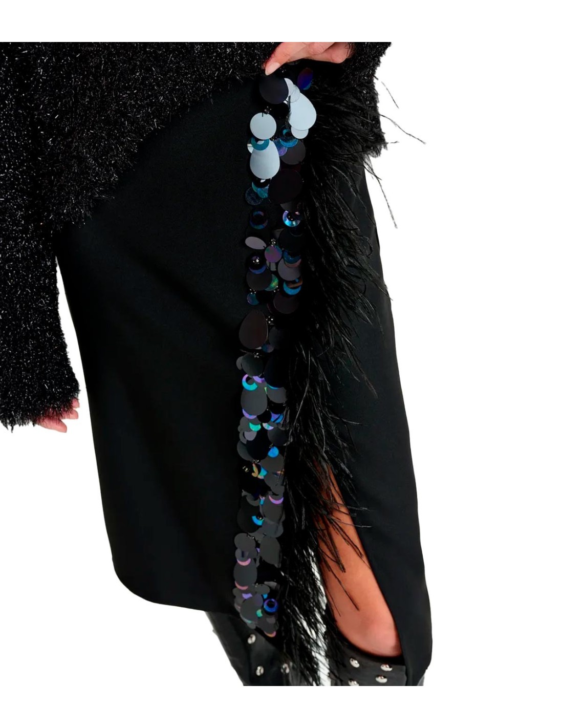 Essentiel AntwerpLa falda midi adornada con piedras y plumas de Essentiel Antwerp combina sofisticación y originalidad en una prenda de impacto. En color negro, presenta un cierre con cremallera oculta y corchetes que garantiza un ajuste elegante. Está adornada con cuentas, lentejuelas y plumas, aportando brillo, textura y movimiento. Su corte recto realza la silueta, mientras que la composición de 97% poliéster y 3% elastano asegura comodidad y flexibilidad, ideal para ocasiones especiales.