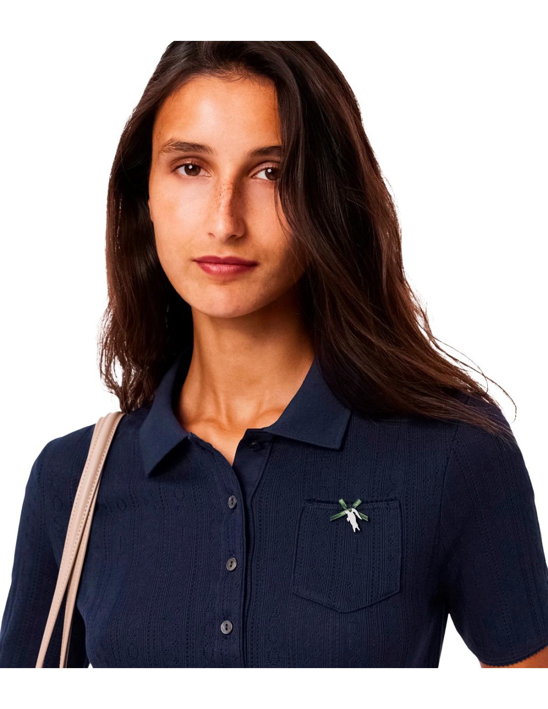 LacosteEste polo azul marino de Lacoste destaca por su delicado motivo de encaje Lacoste que cubre toda la prenda, aportando un toque femenino y elegante. Confeccionado en algodón 100%, ofrece suavidad y confort durante todo el día. Su corte ajustado realza la silueta, mientras los detalles trenzados en las mangas y el bolsillo del pecho añaden un acabado sofisticado. El bolsillo incluye una cinta decorativa y un cocodrilo metálico que aportan estilo y distinción. En la parte trasera, el cocodrilo bordado debajo del cuello completa el diseño con el sello icónico de la marca.