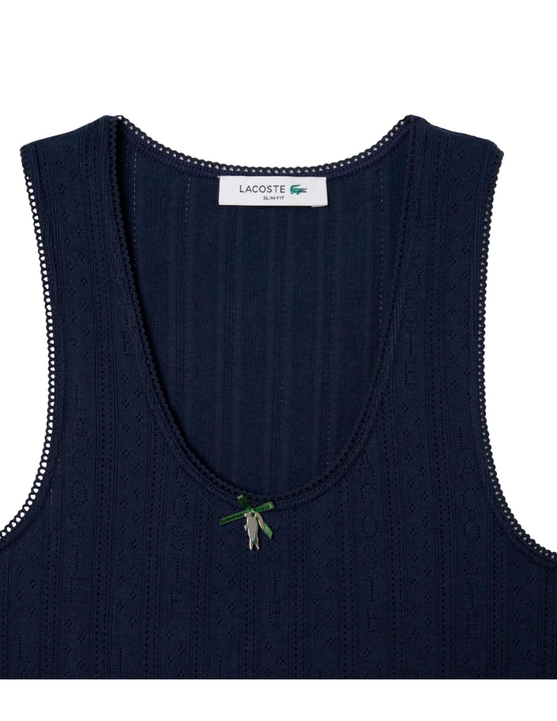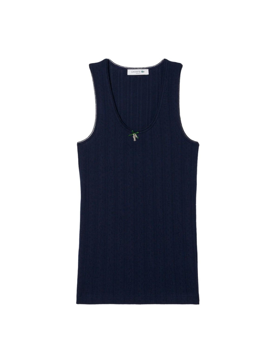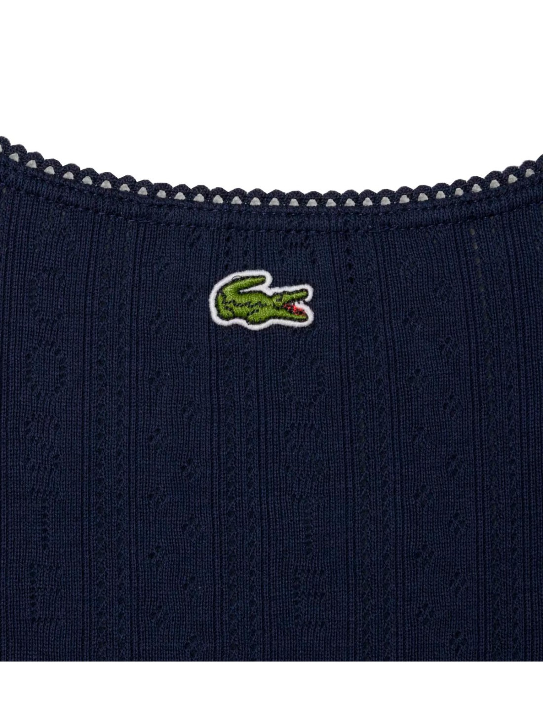 LacosteEsta camiseta azul marino de Lacoste destaca por su diseño femenino y refinado, confeccionado en tejido de punto pointelle de algodón orgánico 100%. Su corte ajustado se adapta al cuerpo, mientras el delicado motivo de encaje con el logo de Lacoste añade un toque distintivo. Detalles como el lazo y el cocodrilo metálico en el cuello, junto con los bordes trenzados en sisas y escote, elevan su estilo. En la parte trasera, el cocodrilo bordado bajo el cuello aporta un acabado sutil e icónico. Ideal para un look casual con elegancia.