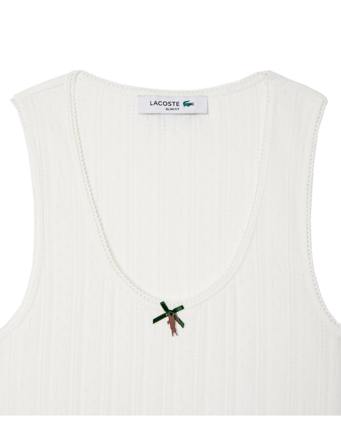 LacosteEsta camiseta blanca de Lacoste destaca por su delicado diseño en tejido de punto pointelle de algodón orgánico 100%, que aporta textura y frescura. Su corte ajustado realza la silueta, mientras el motivo de encaje con logo de Lacoste en toda la prenda añade un toque femenino y sofisticado. Incorpora detalles cuidados como un lazo y cocodrilo metálico en el cuello, y bordes trenzados en las sisas y el escote. En la parte trasera, el icónico cocodrilo bordado debajo del cuello sella su estilo refinado. Ideal para elevar cualquier look casual con elegancia.