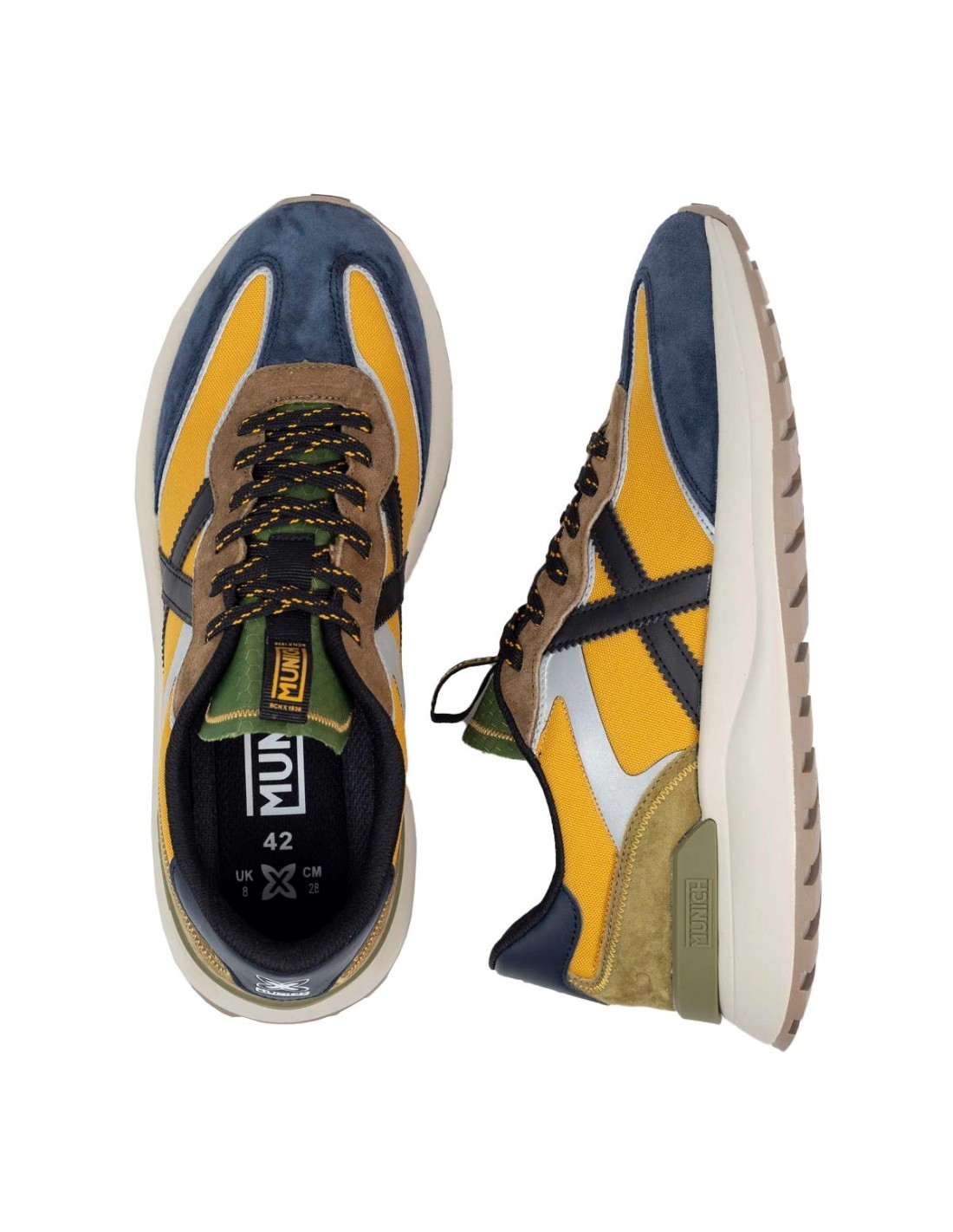 MunichLas zapatillas Dynamix 07 de Munich, en una vibrante combinación de azul, amarillo y verde, destacan por su exterior de piel y tejido sintético que aporta un toque sofisticado. Su interior de tela y plantilla acolchada aseguran una comodidad superior en el uso diario. La suela de fibra sintética con relleno contra el frío las convierte en una opción versátil para cualquier época del año. Con puntera redonda, tacón plano y cierre de cordones, combinan a la perfección estilo y confort.