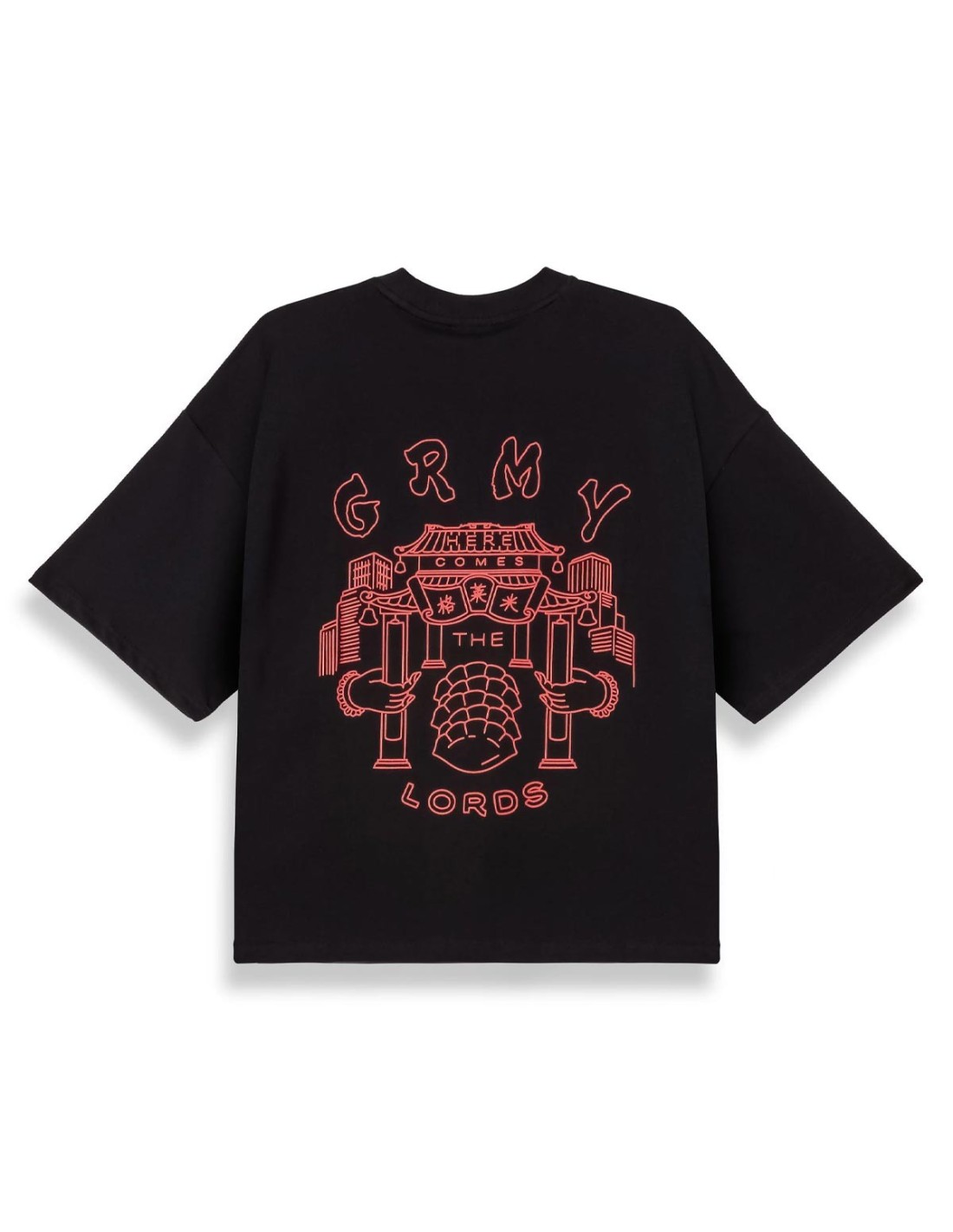 GrimeyLa camiseta Boxy Sampans The Lords de Grimey combina comodidad y estilo urbano en un diseño distintivo. Confeccionada en 100% algodón en color negro, presenta cuello redondo y manga corta con un corte relajado que aporta versatilidad. En el pecho luce el logo GRMY, mientras que en la espalda destaca un templo que refuerza la identidad de la prenda. Una pieza única para looks streetwear llenos de personalidad.