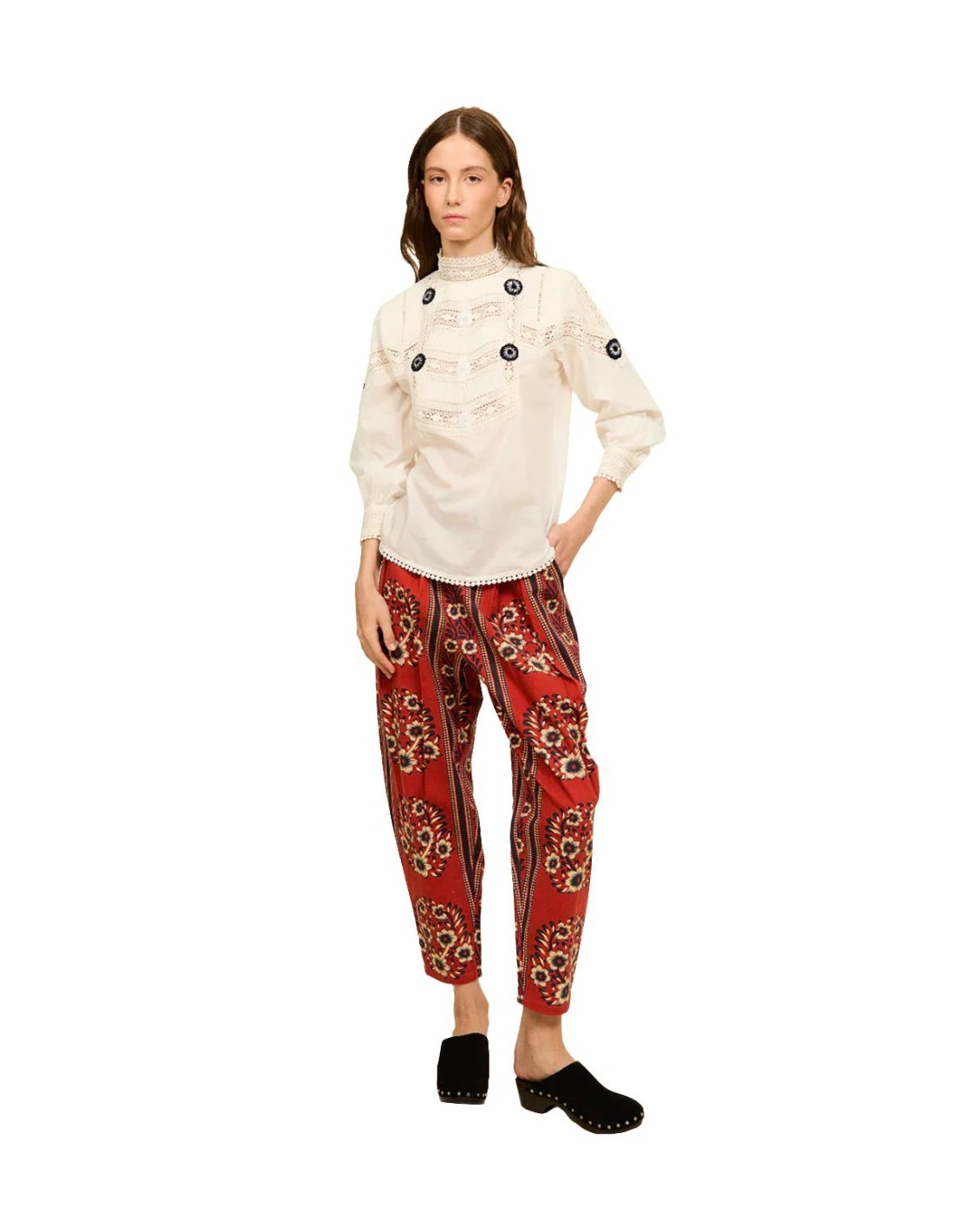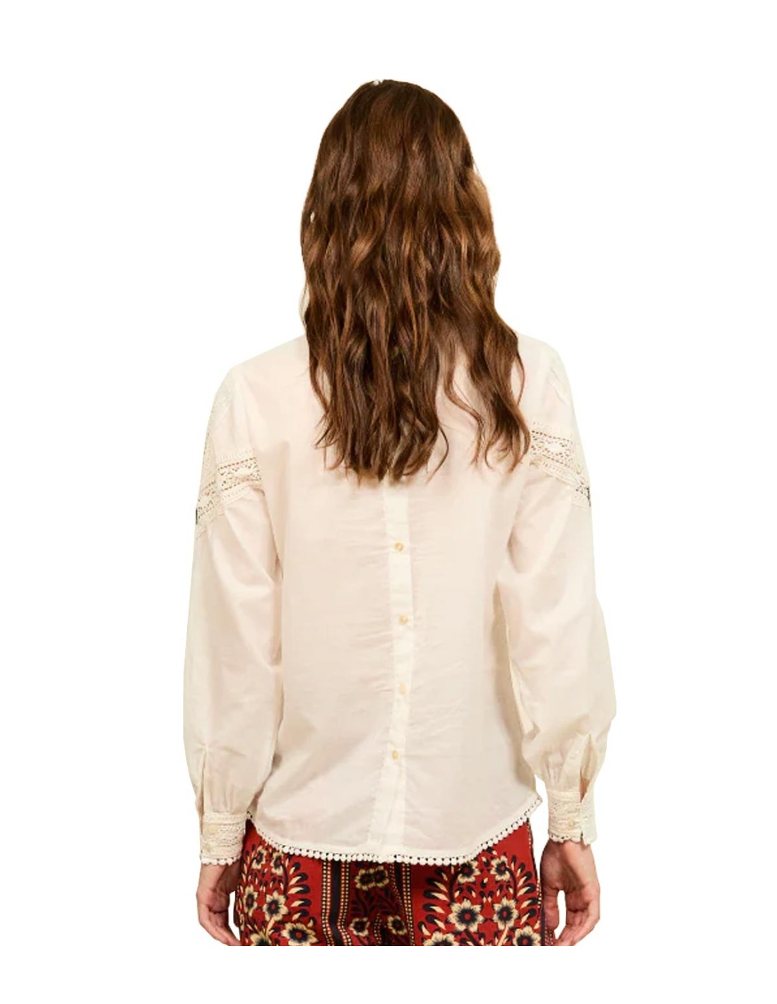 PHILIPALa blusa Regine de Philippa es una pieza de inspiración victoriana que fusiona elegancia clásica con un marcado aire artesanal. Confeccionada en algodón blanco ligero, presenta delicados detalles de encaje en el canesú, puños y hombros, que aportan textura y feminidad. Su diseño resalta por el cuello alto estructurado y el panel frontal con botones blancos y negros bordados a mano con motivo floral, aportando un toque único. Las mangas largas ligeramente abullonadas completan este estilo romántico con un sutil acento bohemio.